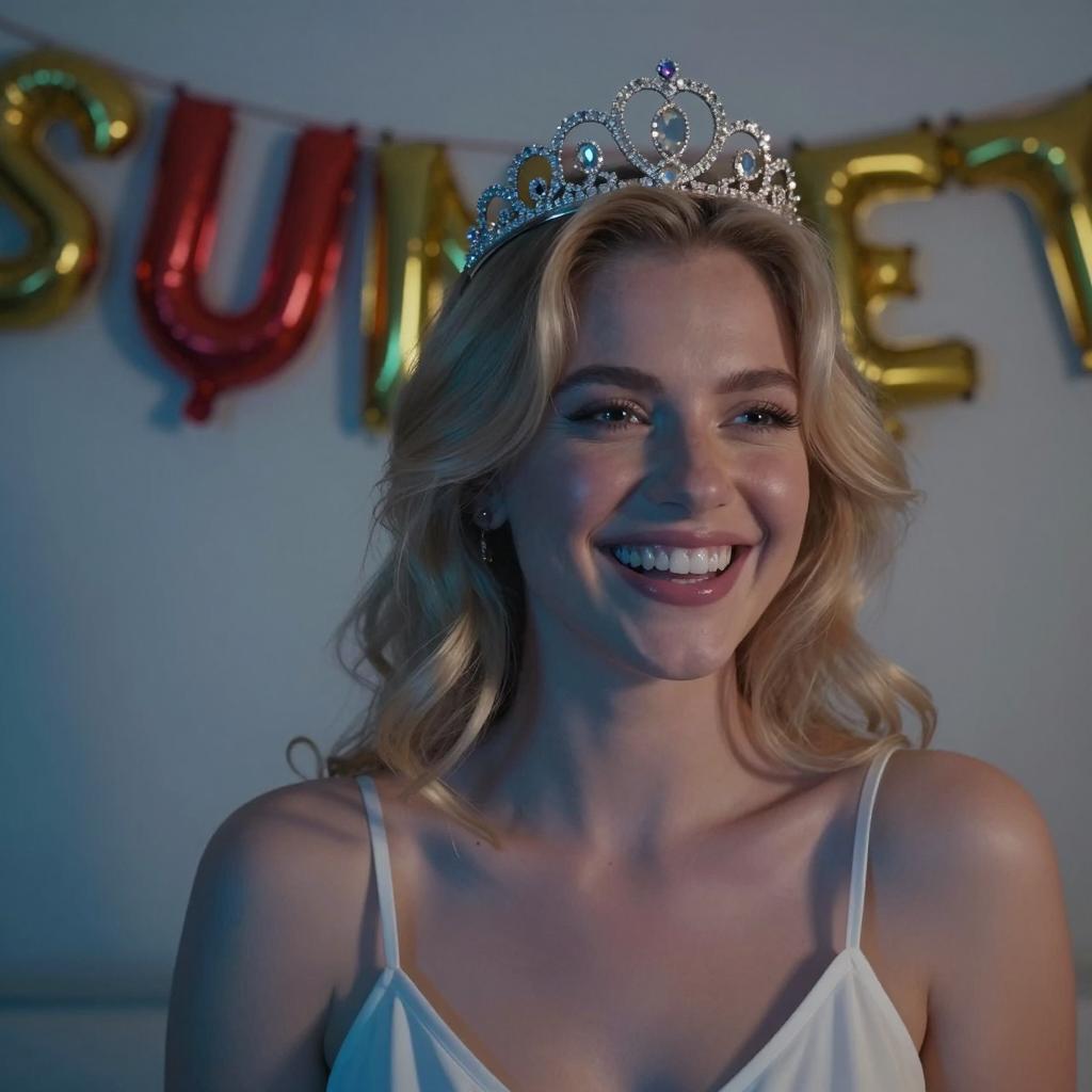 Blonde woman with wavy hair, wearing a sparkling tiara, smiling broadly. Background has glittery, red and gold letters spelling "SUNSET." She is wearing a white spaghetti-strap top. Dim, blue-tinted lighting. Upper body focus. Single person.