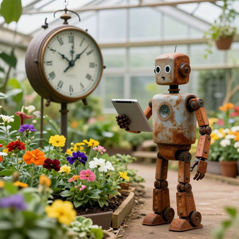 Rustic robot stands attentively in a verdant greenhouse, holding a tablet as it observes a large, vintage clock beside a vibrant garden of blooming flowers, symbolizing the passage of time amidst nature's growth.