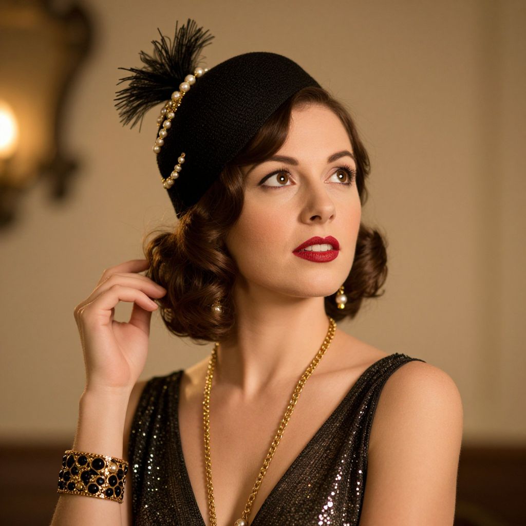 Elegant flapper woman gazing thoughtfully upward, adorned in a black cloche hat embellished with gold accents and pearls, paired with a shimmering gold necklace and matching bracelet, her short wavy hair framing her dreamy expression against a softly lit, vintage-inspired backdrop.