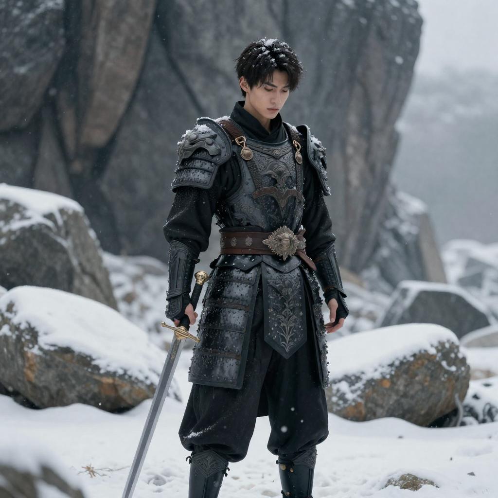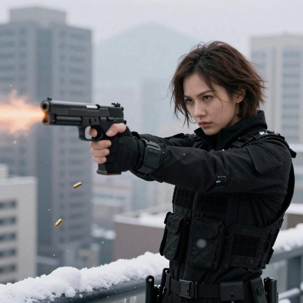 Blond warrior with shoulder-length hair in dark, metallic armor, firing a gun with a bright orange flame. Background: industrial metal grid with dim lighting. Right side: vertical metal structure. Intense expression, serious pose, close-up shot.
