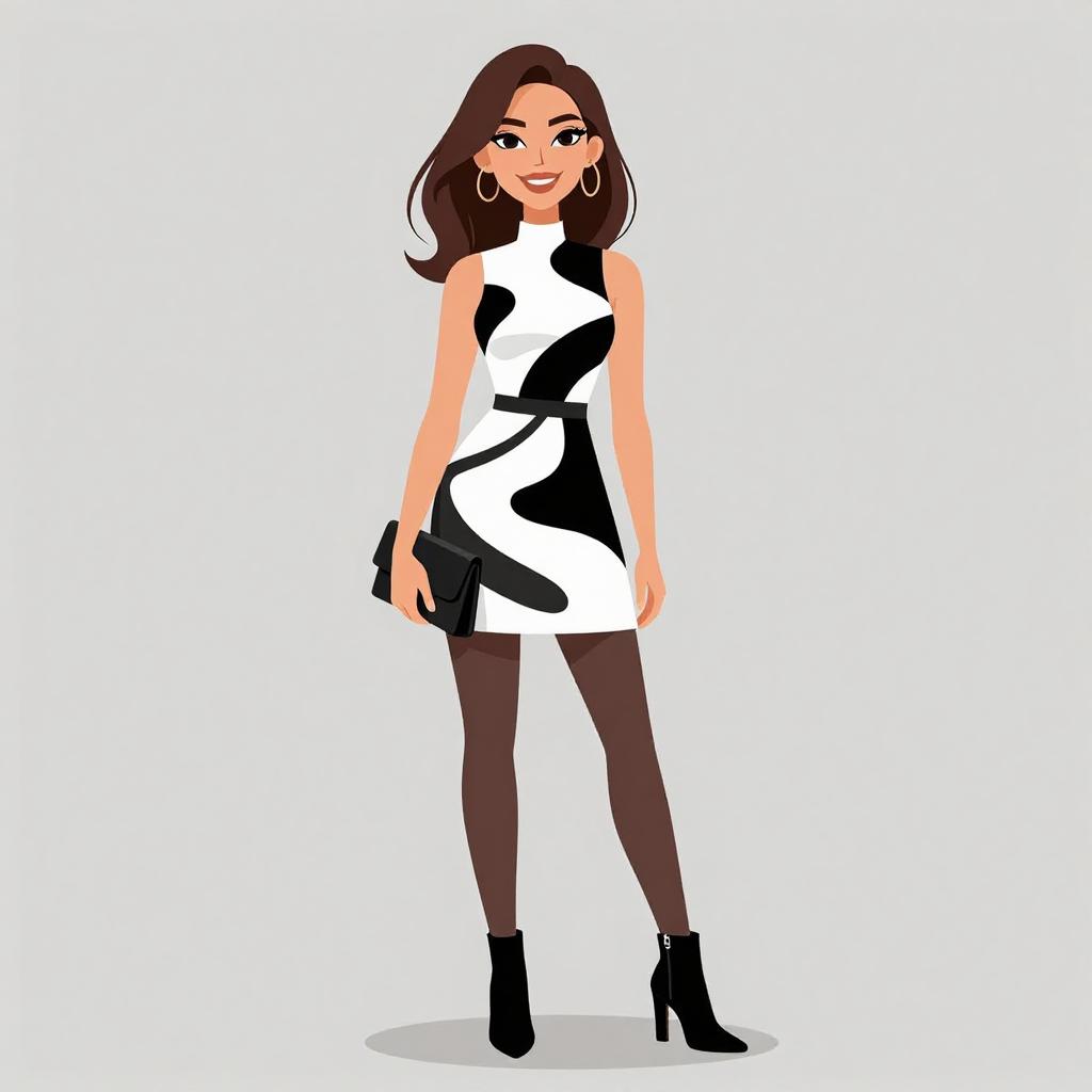 Woman with pretty face and pretty hair. smiling Woman, minimalist, sleeveless shift dress in black and white grid pattern, high round neckline, thigh-length hem, black ankle boots with slightly raised heels, black leather shoulder bag, simple straight hairstyle, plain white background. --sref 1467
