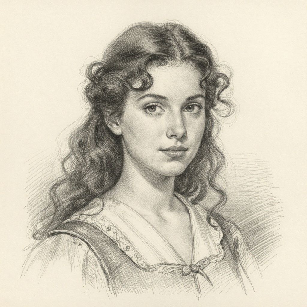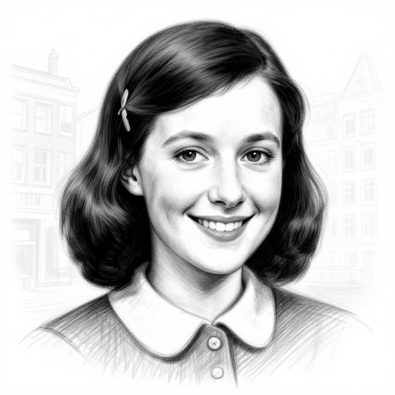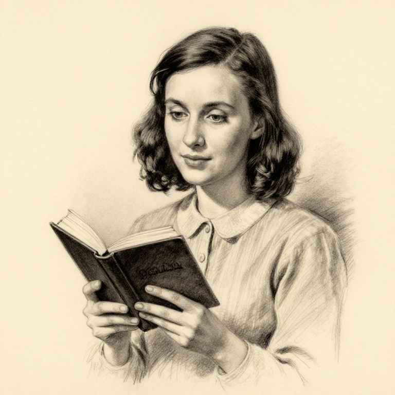 Anne Frank sketch, realistic charcoal drawing of Anne Frank holding a diary, gentle light and shadow play, somber mood with subtle grainy texture on old paper