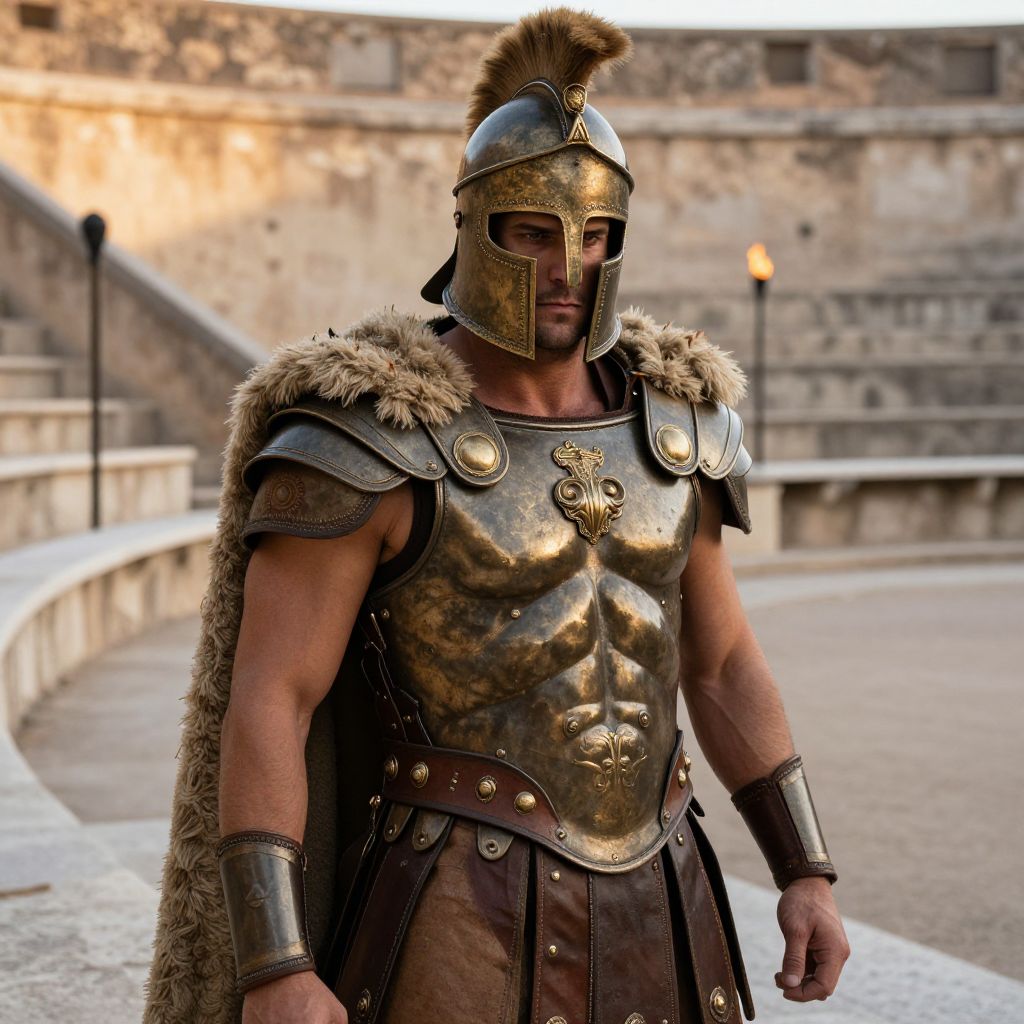 Photograph of a muscular man in ancient Roman gladiator armor standing in a coliseum. He wears a bronze helmet with a feathered crest, a fur-lined cape, and metal shoulder armor. His chest armor is embossed with intricate designs, and he has a brown leather skirt with a belt. His skin is tan, and his expression is serious. The background shows the curved stone seating of the coliseum, with a single torch lit in the distance. The lighting is natural, casting soft shadows. The texture of the metal armor is polished and reflective.