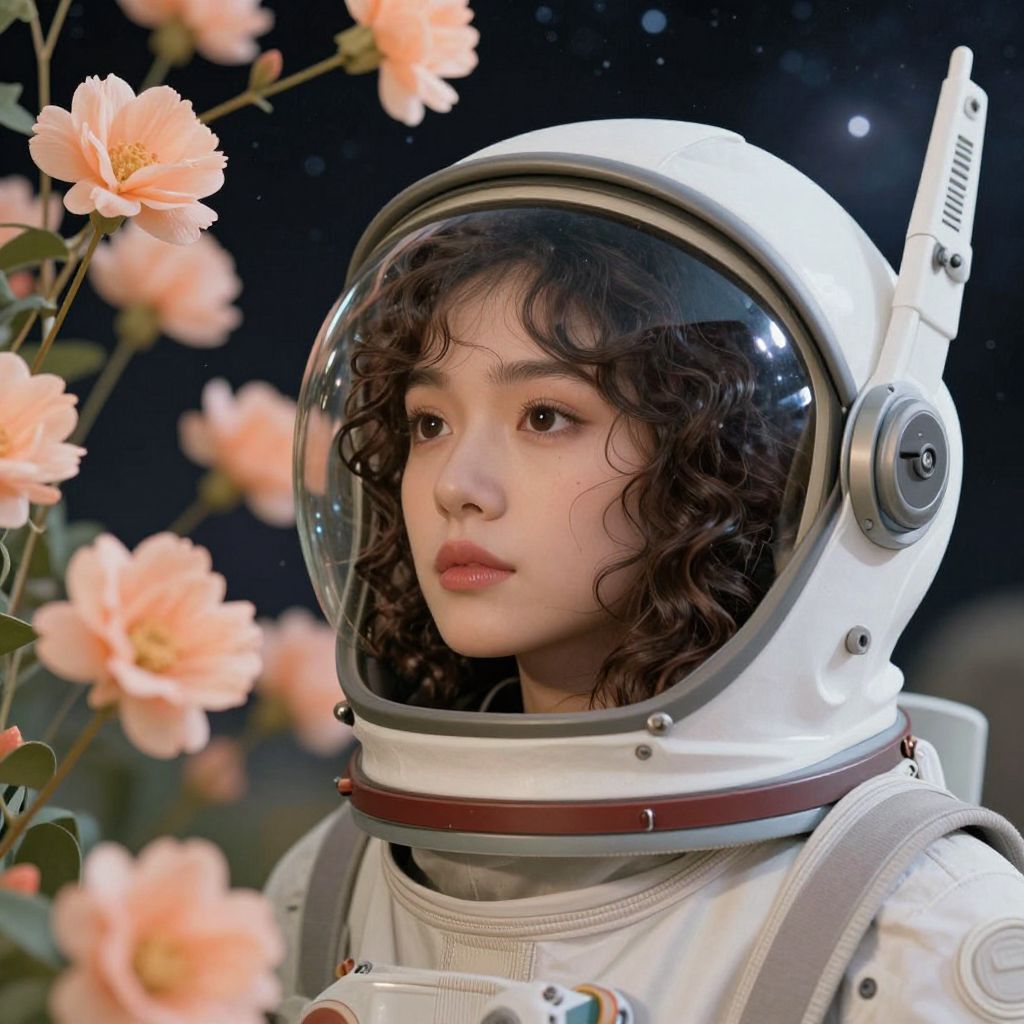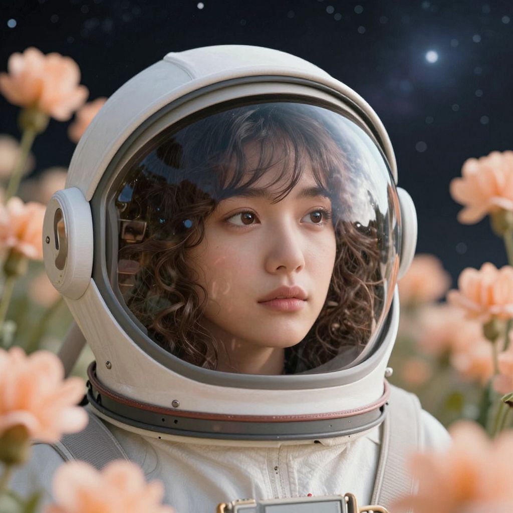 A young woman inside a space helmet, gazing thoughtfully, She has wavy dark hair, and the visor of her helmet is clear, showing her serene expression, Around her, peach-colored flowers, creating a contrast between the soft, delicate blooms and the hard, futuristic space helmet, The background is a cosmic, starry scene, blending elements of nature and space
