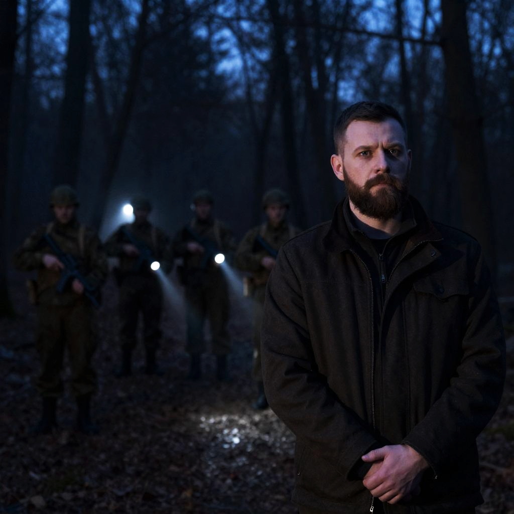 Man in military green shirt and black beret holds submachine gun with ammo belt across chest. Background: burning wooden tent. Forest setting with misty atmosphere. Intense expression. Forest trees in background. Nighttime.