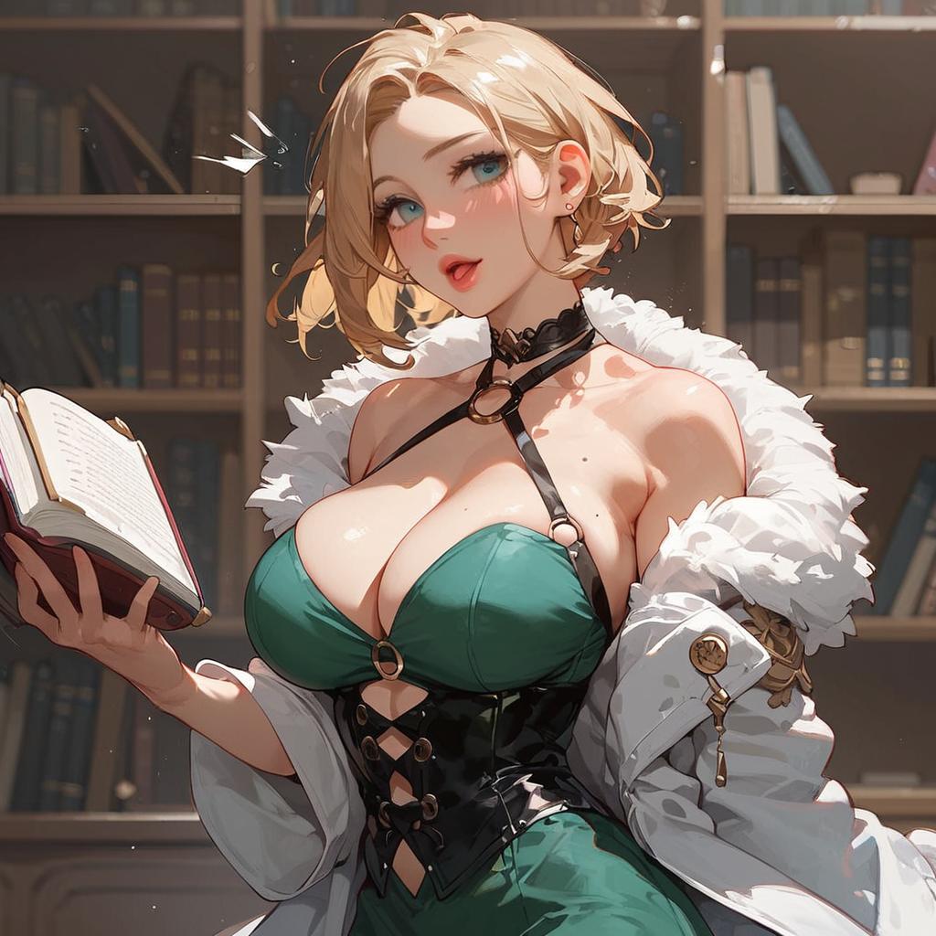 Score_9, score_8_up, score_7_up, score_6_up, source_anime, short hair, mole under eye, eyeshadow, lipstick, black choker, o-ring, halterneck, cleavage, green dress, corset, white coat, fur trim, library, holding book, large breasts, surprised, looking at you, from side