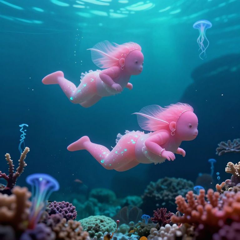 Photograph of an underwater scene featuring six white, ethereal mermaid-like figures with flowing hair and translucent fins, surrounded by glowing jellyfish. The mermaids have varying poses, with some standing on rocky formations and others sitting, all adorned with small, glowing crowns. The background is a deep blue ocean, illuminated by sunlight filtering from above. The foreground includes pink starfish and colorful coral, adding to the fantastical atmosphere. The jellyfish and mermaids emit a soft, luminescent light, creating a magical, otherworldly ambiance.