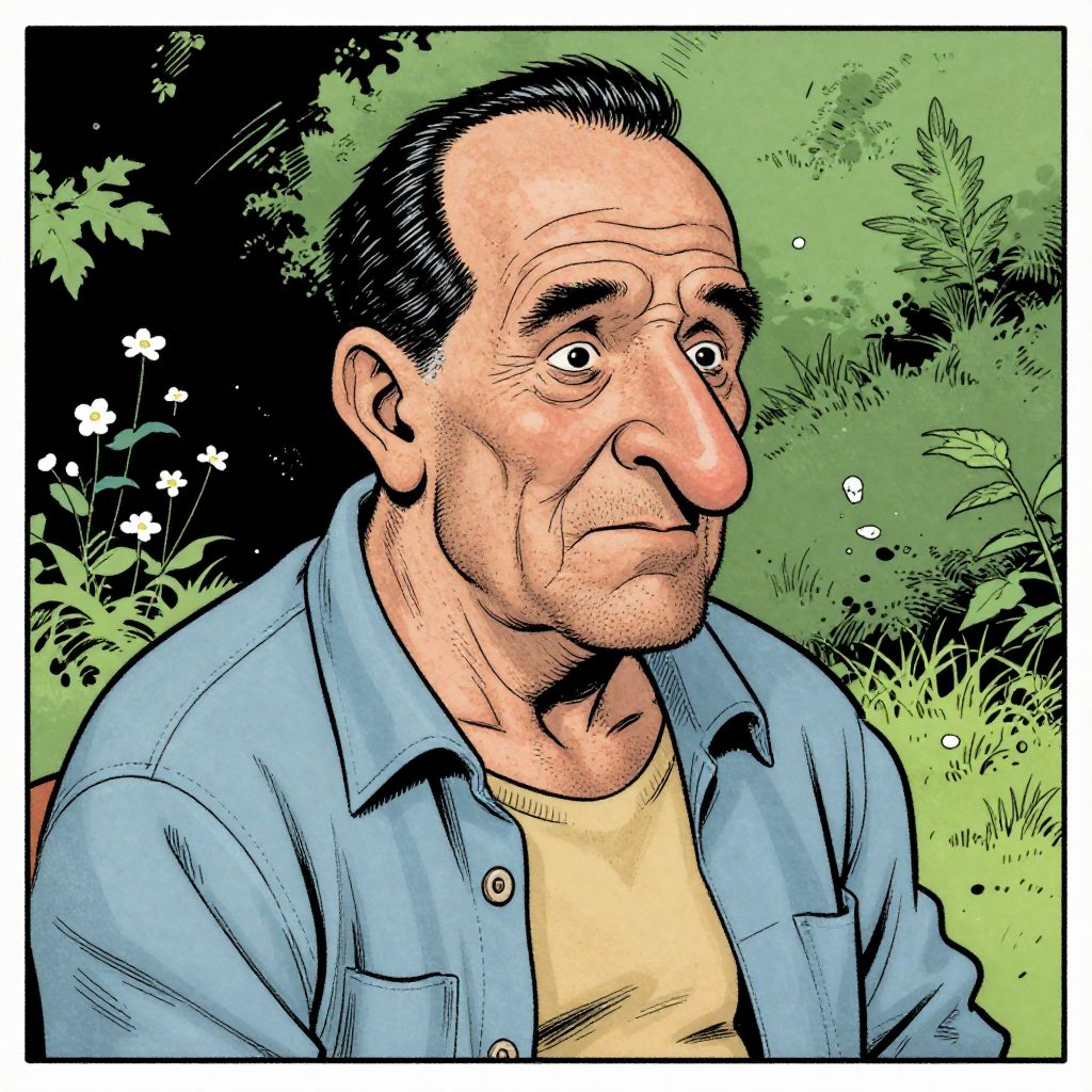 Dramatic Robert Crumb style comix, 70 years gentle old strong man, short salt and pepper black hair, large hooked nose, receding hairline, short cropped beard, sitting in garden,
