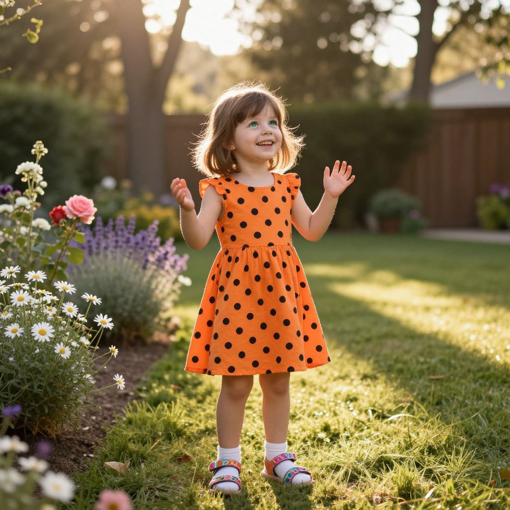 A young girl with short brown hair, bright green eyes, and a cheerful, radiant smile stands in a sunny backyard. She wears an orange and black polka dot dress that flutters slightly in the breeze, paired with white socks and colorful, patterned sandals. Her hands are gently lifted as if reaching toward the sky, adding to the sense of joy and wonder. The scene is warm and vibrant, with a variety of blooming flowers—such as daisies, roses, and lavender—spreading across the lawn, and soft sunlight filtering through the tall trees in the background. Golden hour lighting creates long, gentle shadows, enhancing the nostalgic and heartfelt atmosphere. The overall mood is joyful, carefree, and full of childhood innocence, evoking a sense of timeless warmth and peace.