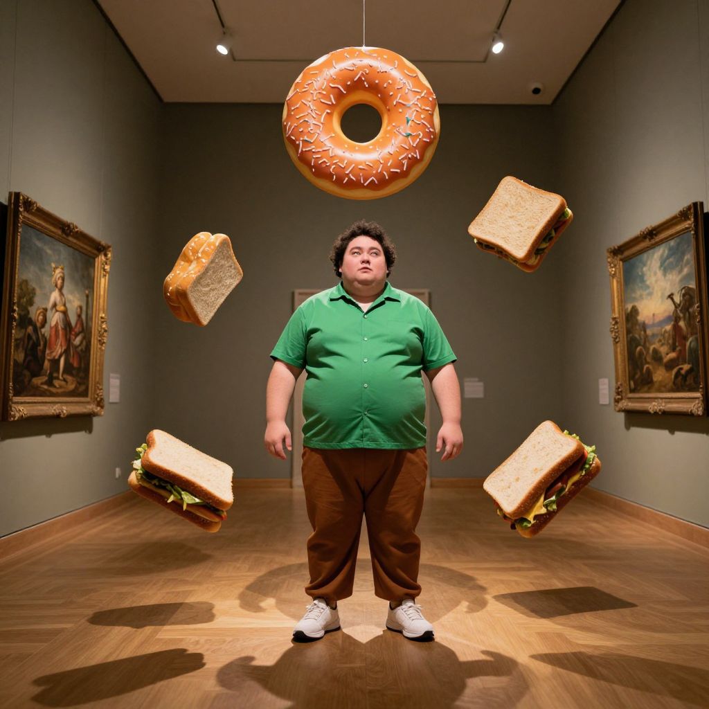 In a contemporary museum setting, an obese man stands as the central figure, his body adorned with a vibrant green shirt and contrasting brown pants. He is surrounded by an array of floating objects, including a large, glazed donut with sprinkles hanging above him, and several sandwiches suspended in the air. The museum's walls are adorned with framed paintings, adding an artistic touch to the scene. The lighting is cinematic, casting long shadows and creating a dramatic effect, with warm hues of gold and muted greens dominating the palette. The overall composition is dynamic, with the man and his floating food items creating a sense of movement and whimsy within the otherwise static museum environment.