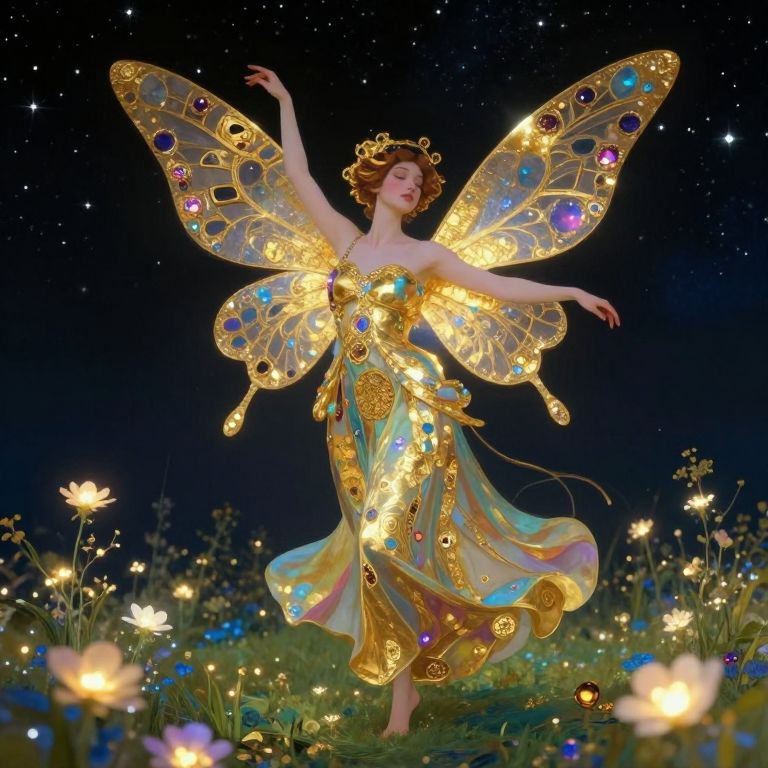 Glowing fairy in golden, iridescent wings and dress, surrounded by twinkling flowers and stars, dancing under a starry night sky.