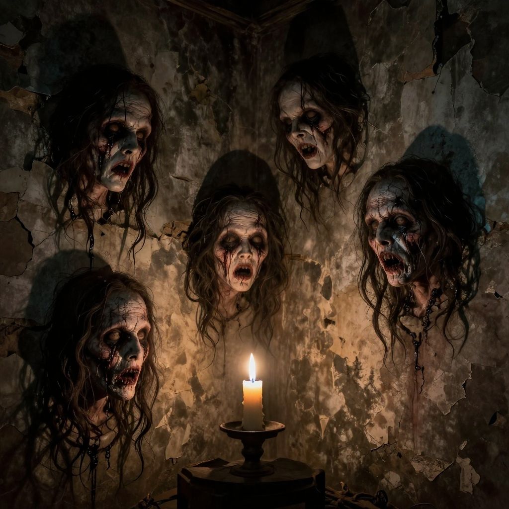 Creepy distorted faces embedded in decayed walls, flickering candlelight casting eerie shadows, twisted and fragmented visages, gothic horror style, ominous atmosphere