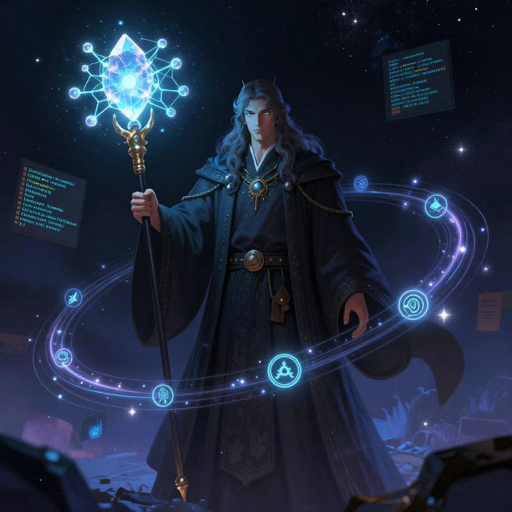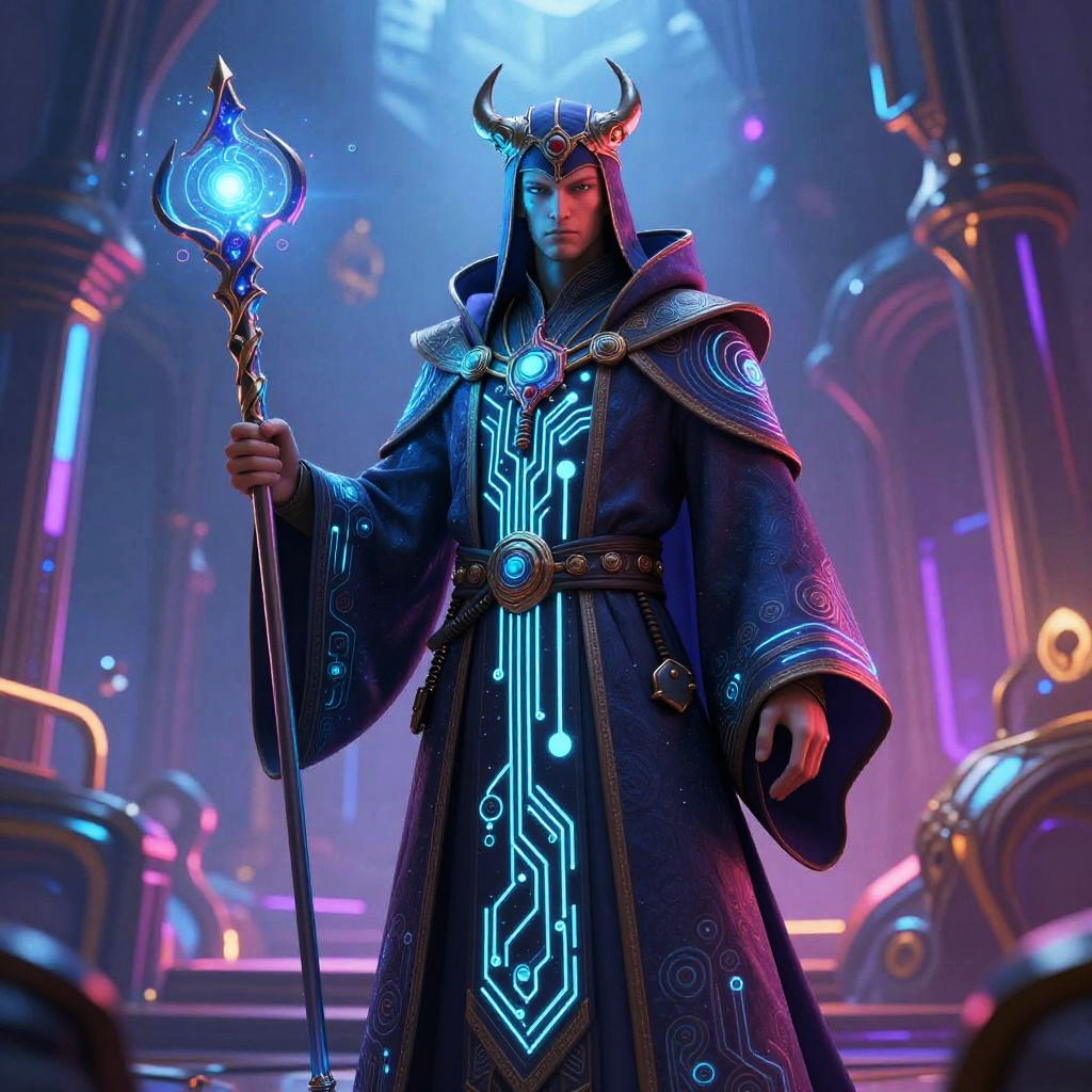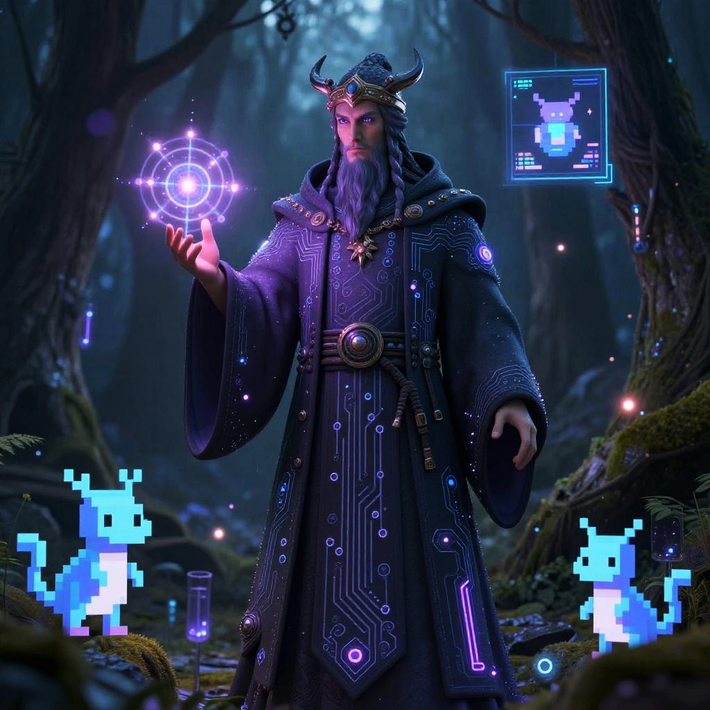 A mage AI image generator visualization showing an ancient wizard merged with artificial intelligence, robes embedded with circuit patterns, conjuring pixelated magical creatures in a dark enchanted forest, illuminated by ethereal holograms and neon data streams.