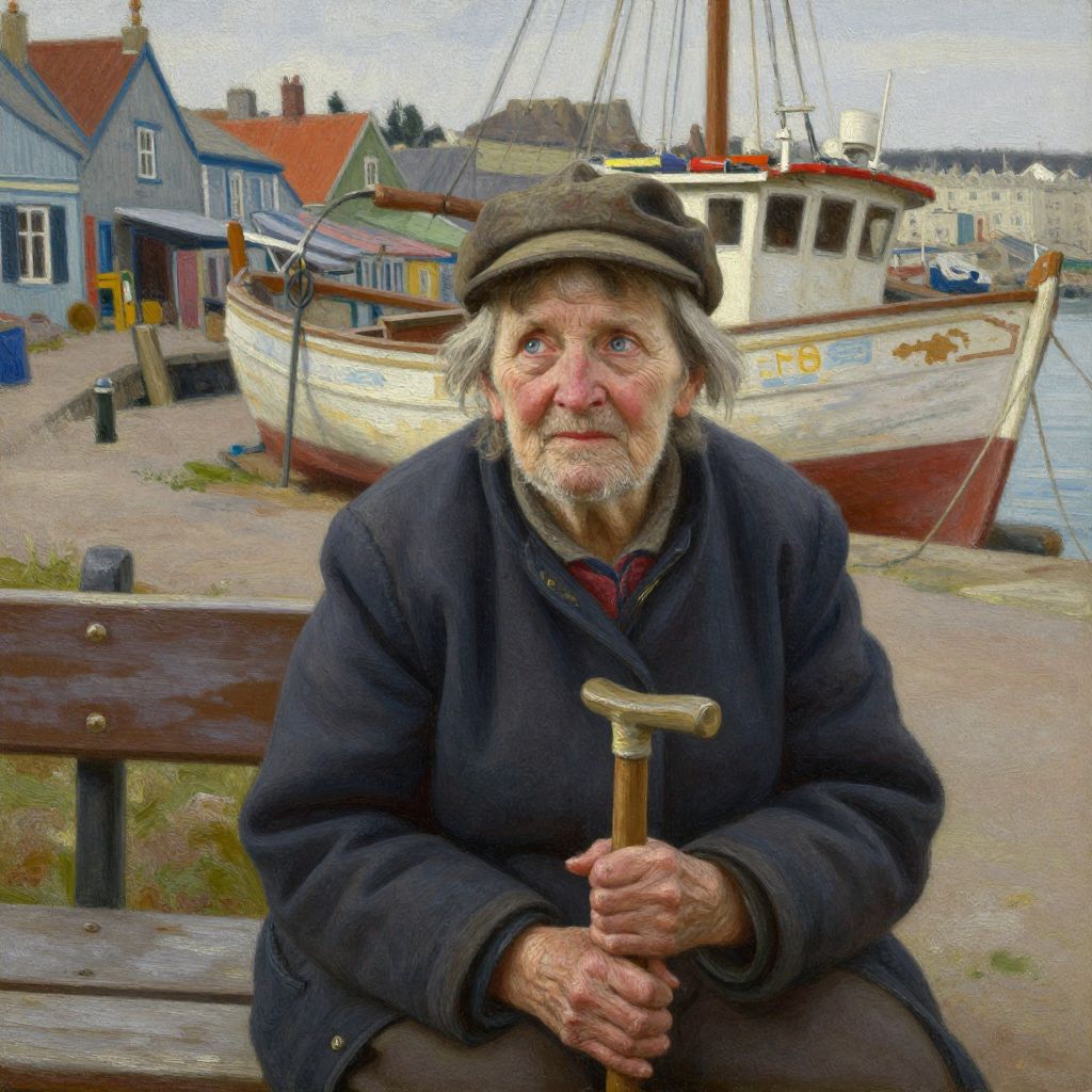 Depict an elderly woman with serene blue eyes and a grizzled beard, seated on a rustic wooden bench in a charming harbor town. Her gaze, filled with melancholy nostalgia, rests upon her weathered boat in the distance as she offers a wistful smile. Capture this intimate moment from a unique bug's-eye view perspective, emphasizing closeness and introspection while highlighting the details of her worn cap and calloused hands on her walking stick. Craft the portrait in an impressionistic oil painting style, imbuing it with the rich textures and colors that evoke classic portraiture's emotional depth, thus encapsulating the essence of a life lived at sea.