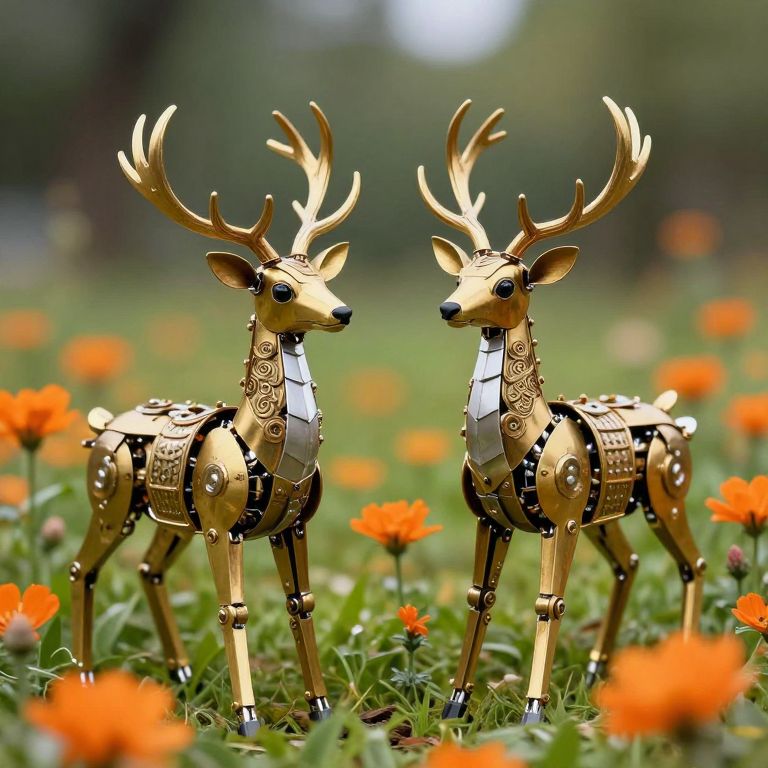 Two clockwork deer with golden antlers and intricate brass armor stand gracefully amidst a vibrant field of orange mechanical flowers, their metallic bodies contrasting with the lush greenery and soft focus background.