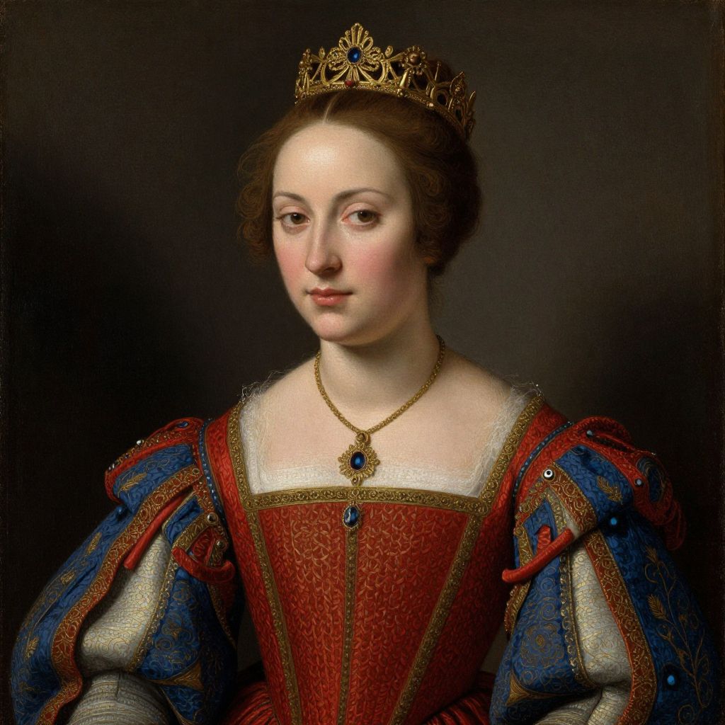 Renaissance-style portrait of a fair-skinned woman with brown hair, wearing a gold crown, red and blue gown with puffed sleeves, and