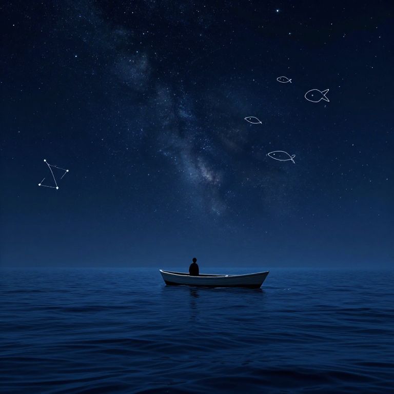 Under a starlit sky where fish become celestial constellations, a solitary figure in a small boat drifts through the boundless ocean, navigating the infinite expanse with a quiet resolve, their journey a metaphor for the soul's quest for meaning amidst the cosmic vastness.