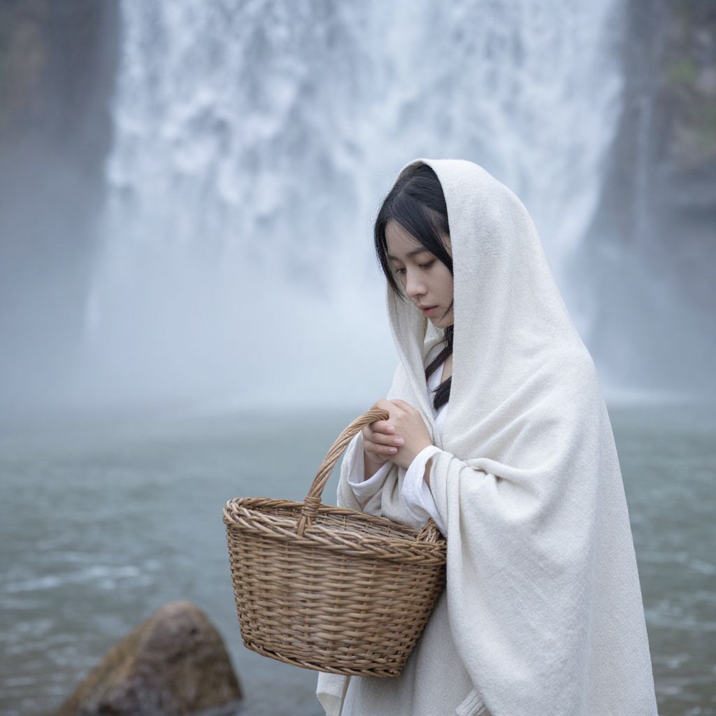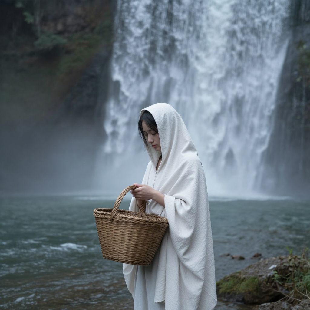 Serenity whispers through the mist as a woman, cloaked in simplicity and introspection, cradles a woven basket near the cascading waterfall, her presence a harmonious blend of solitude and connection with nature’s eternal rhythm.