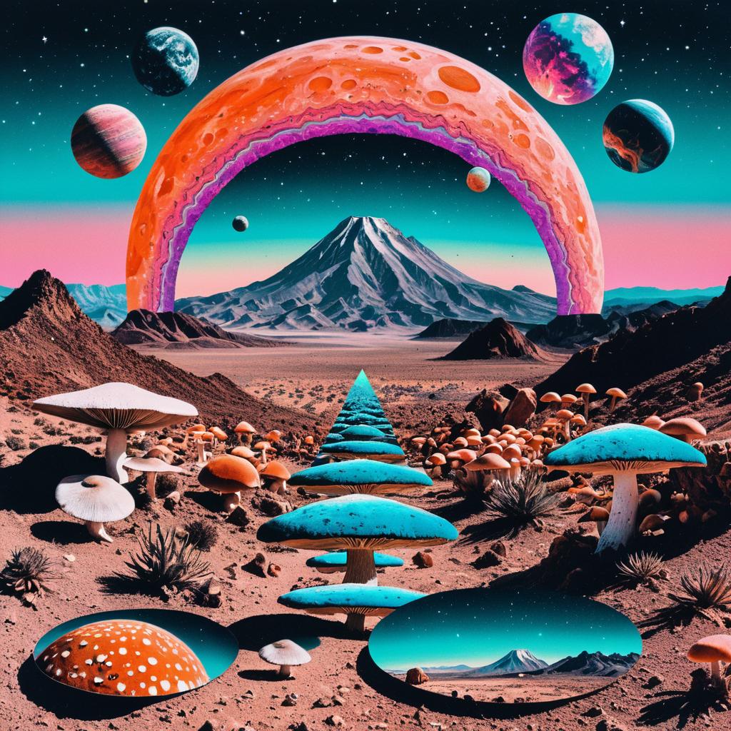 Surreal Psychedelic collage of spliced photographs, mushrooms, crystals, alien landscapes, desert landscapes, mountain landscapes, space, planets, orbs, kaleidoscopic patterns, neon vaporwave