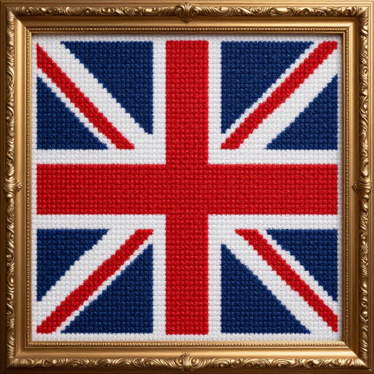Framed Union Jack-inspired cross-stitch artwork featuring bold red, white, and navy blue colors, intricately stitched in a geometric pattern within a gold ornate frame.