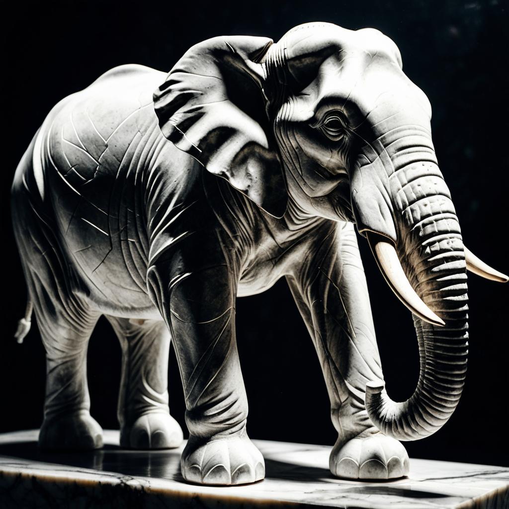 Hyper-realistic render of biomechanical elephant statues with intricate wooden carvings and polished chrome finish. The statues showcase detailed mechanical and organic design elements, displayed on a wooden surface against a dark background, symbolizing themes of AI alignment and self-replication.
