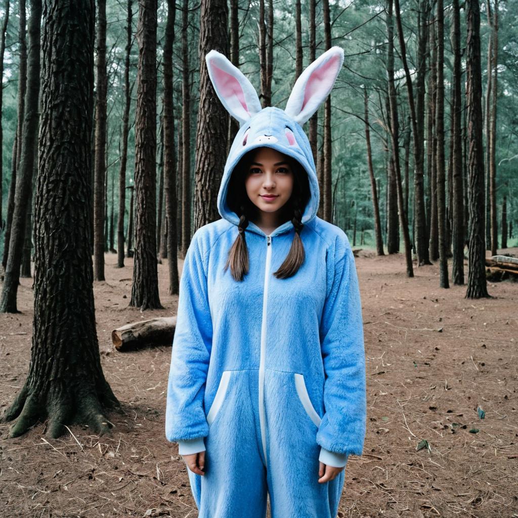 Young woman with brown twin braids wearing a blue plush rabbit kigurumi with a hood featuring rabbit ears, standing outdoors in a dense pine forest. The costume has a zipper front and white pocket details, and the woman is looking directly at the camera with a neutral expression.