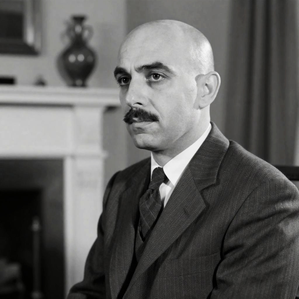 Black-and-white photograph of two men in a restaurant. Military officer with peaked cap, mustache, and uniform points at a glass. Clean-shaven man in dark suit, tie, and white shirt looks intently at officer. Table with glasses, napkin, and dessert. Officer's left hand on table. Background has ornate curtain and window. Both men seated. Officer's expression stern, clean-shaven man's expression intense.