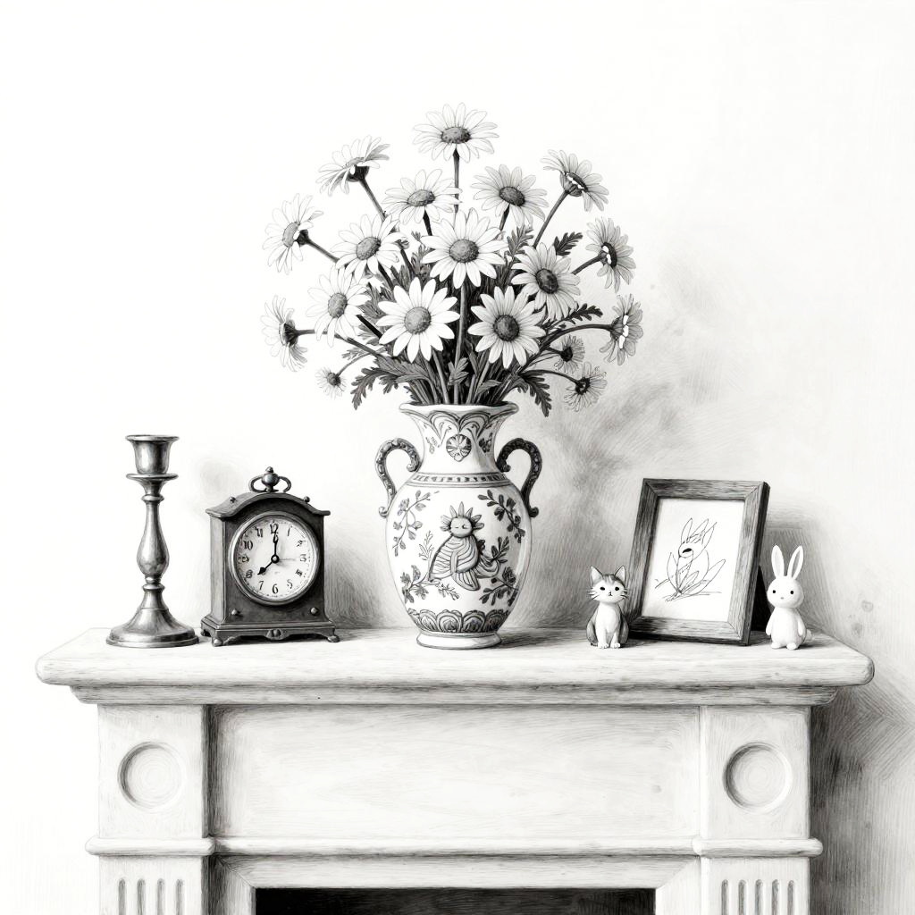 Black-and-white, whimsical hand-drawn still life on a old-fashioned mantelpiece, centered on ornate porcelain vase with wild daisies. Arranged around it: brass candlesticks, vintage clock, small framed sketch. Tiny figurines of a cat and a rabbit add charm. Background is minimal, a few lines suggesting a wall and horizon. Soft shading, gentle crosshatching, delicate line art, balanced negative space, subtle paper grain, calm studio light, sketchbook aesthetic.
