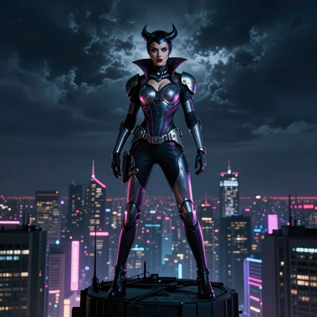 Harley Quinn transforming into a glowing, cyberpunk version of herself in a ruined city rooftop, floating with electric energy trails, wearing sleek armor and a battle helmet, stormy sky behind, action sequence, high intensity, detailed effects, MidJourney style
