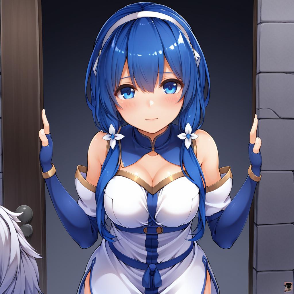 Digital anime-style illustration of a young woman with blue eyes and long blue hair styled in pigtails adorned with white flower accessories. She wears a detailed Pegasus Knight uniform featuring a blue and white color scheme with gold accents, fingerless elbow gloves, and a headband. The character stands in a doorway with a slightly shy or hesitant expression. The illustration is inspired by Fire Emblem character designs.