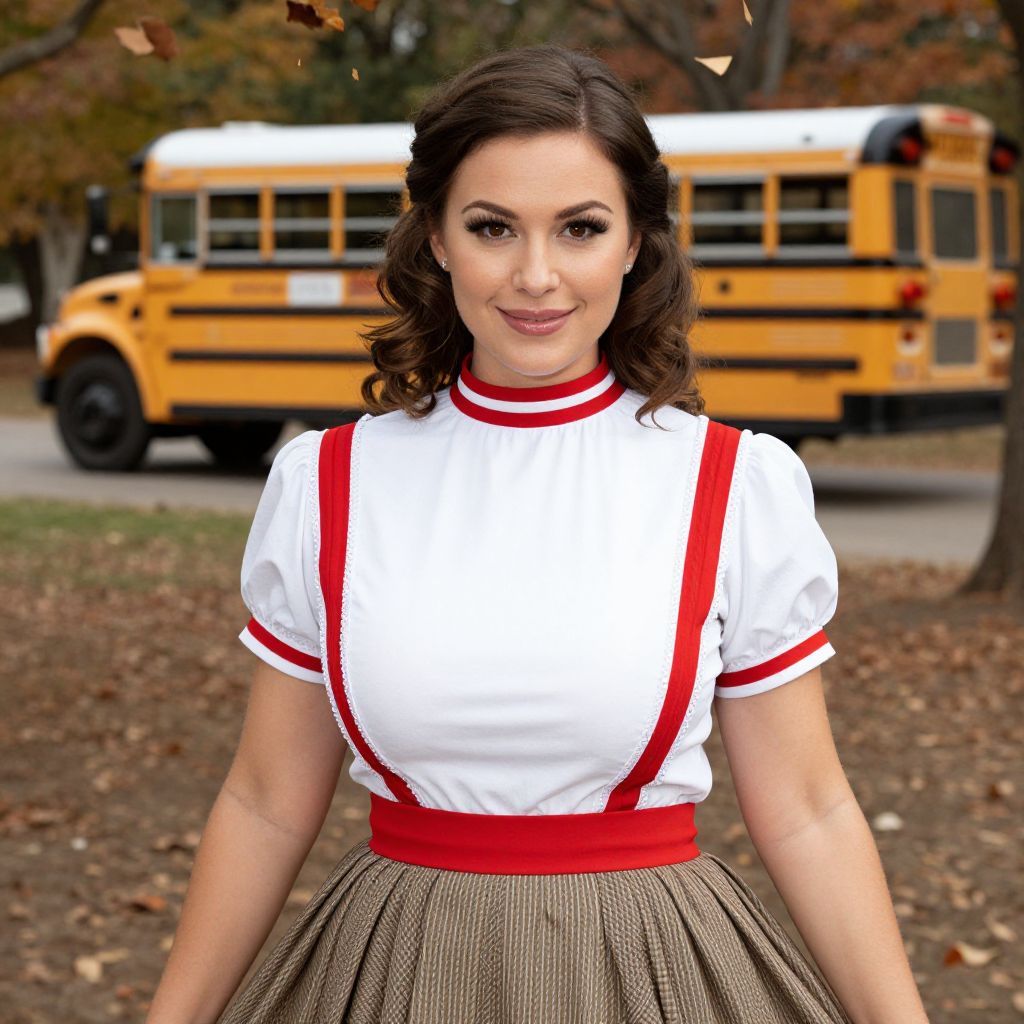 Photograph of a smiling, fair-skinned woman with dark brown, wavy hair wearing a white, short-sleeve, red-trimmed shirt with red suspenders and a high-waisted, brown, checkered skirt. She stands outdoors in autumn, with a yellow school bus blurred in the background. Fallen leaves and trees with orange and brown foliage are visible. The woman's makeup is subtle, and she wears small hoop earrings. The image has a bright, vivid color palette and a slight depth-of-field effect, focusing on the woman while the background remains slightly out of focus.