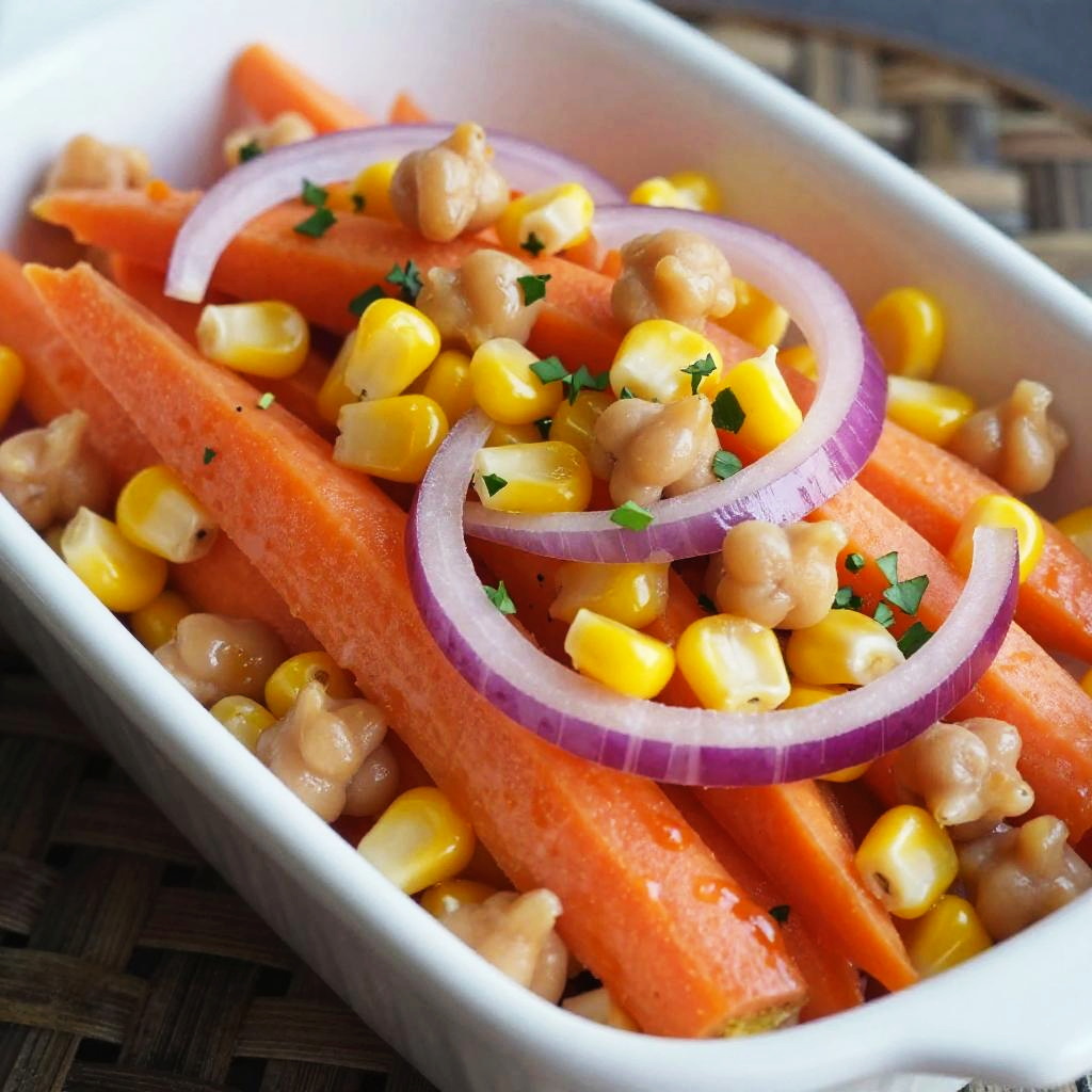 Close-up of a fresh and colorful salad featuring carrot sticks, corn kernels, red onion slices, and chickpeas, garnished with finely chopped herbs. The salad is served in a white rectangular dish placed on a dark woven basket, showcasing vibrant textures and bright natural lighting.