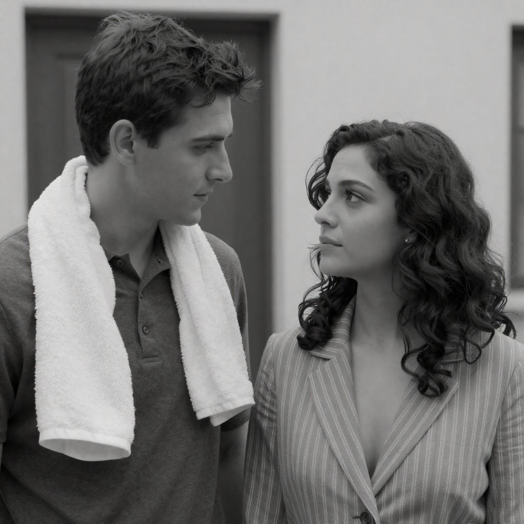 Black and white photograph featuring a young man with short dark hair wearing a polo shirt and a white towel draped around his neck, standing outdoors next to a woman with wavy shoulder-length hair wearing a striped blazer. Both subjects are looking at each other, with a blurred background of a textured wall and a door behind them.