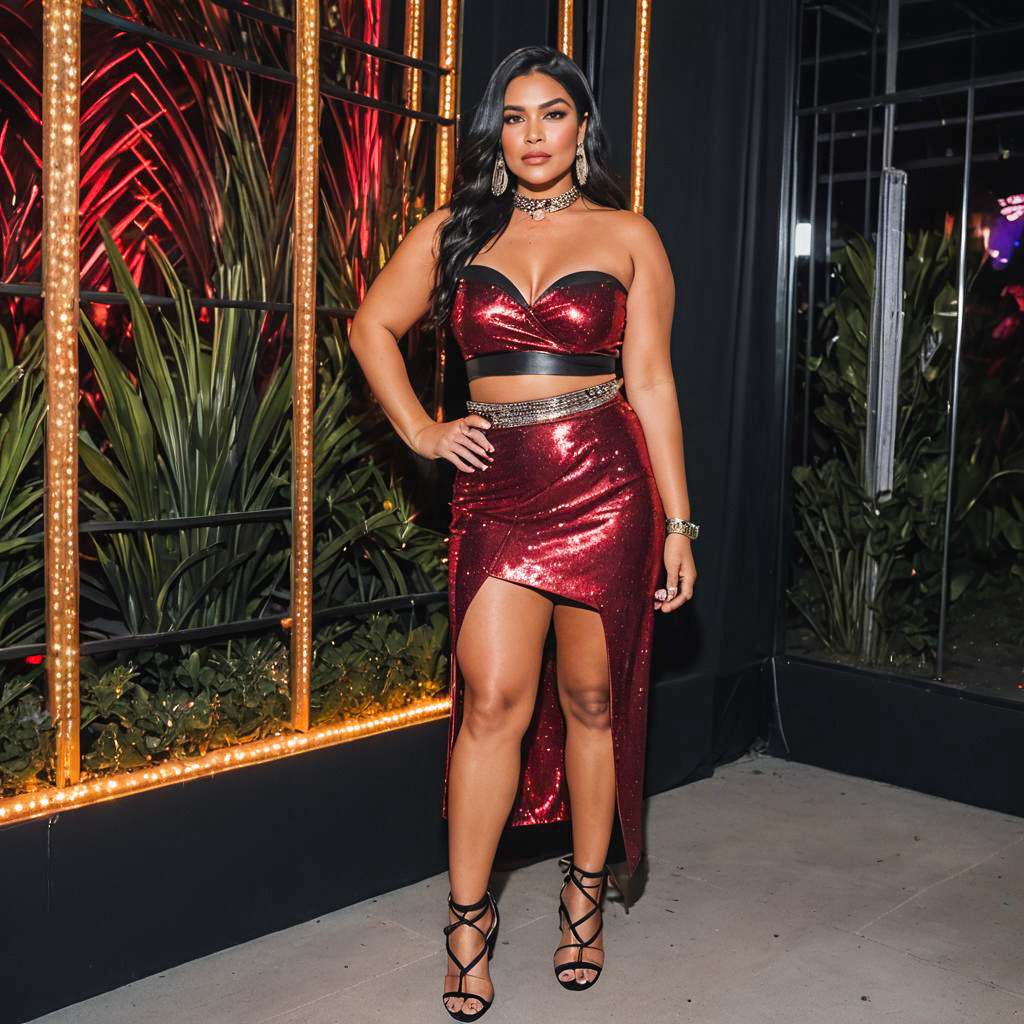 Photo of a Curvy woman, Sleek Straight, charli damelio coachella outfit, Embellished bandeau top with wrap-around denim skirt and strappy heels, deep crimson, shiny black, metallic bronze, glamour shot