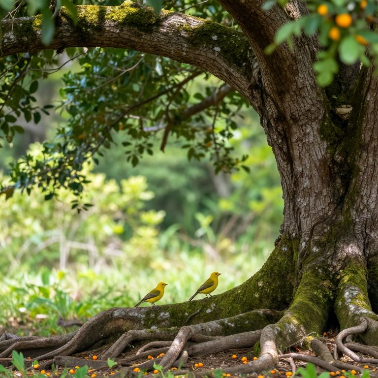 Two vibrant yellow birds perch gracefully on the moss-covered roots of a sprawling tree, surrounded by a serene forest landscape where sunlight filters through lush green foliage and small orange fruits dot the ground.