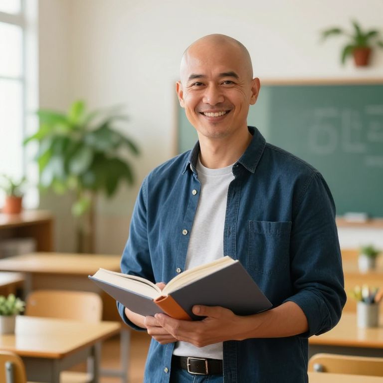 Portrait of a bald teacher with a warm smile, holding a book in a bright, colorful classroom filled with plants and learning materials, dynamic and inviting atmosphere.