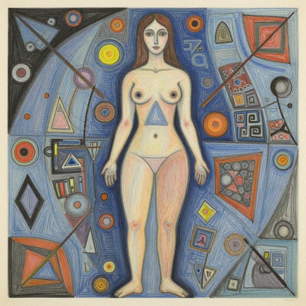 The album cover features a full woman figure in the style of Adolf Wölfli, with a horror vacui approach, incorporating geometrical motives and esoteric themes. The figure is depicted in a schizophrenic style, with a drawn-by-hand appearance using cheap crayons on paper, resulting in pale colors. The background is a complex interplay of shapes and patterns, including circles, triangles, and abstract designs, creating a sense of depth and movement. The overall composition is intricate, with elements arranged in a way that draws the viewer's eye across the entire image, highlighting the interplay of colors, textures, and shapes. The cover exudes an art brut primitivist feel, with a sense of raw, unrefined expression.
