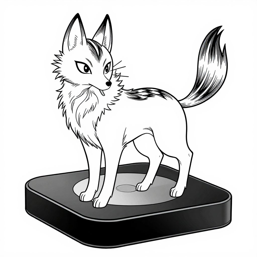 Black and white digital drawing of a small, alert fox with a bushy tail, standing on a rectangular platform.