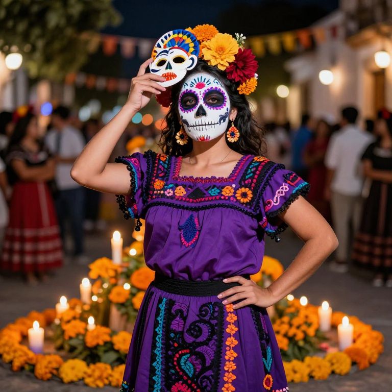 A confident female in festival attire, dressed as a Mexican Day of the Dead dancer with colorful skull makeup, a bright purple and black embroidered dress, and traditional hand-carved mask on her face, standing at a festival in Oaxaca, Mexico, surrounded by candles and marigold flowers, cinematic and realistic lighting.