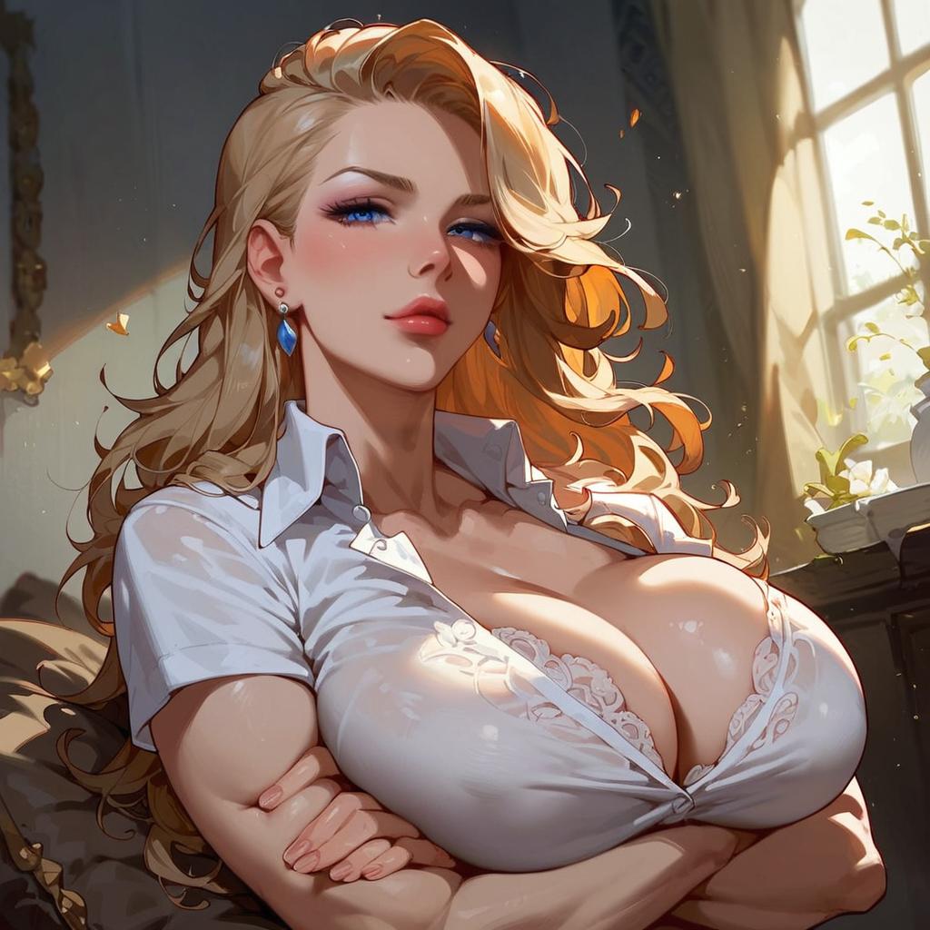 Score_9, score_8_up, score_7_up, source_real, source_explicit, nsfw, , view from front, full body portrait, jenny_cox, jenny_cheeruniform, 1girl, angular features, blonde hair, red top, white skirt, single side slit, sneakers, "C" written on shirt, "Jenny" written on shirt, wedding ring, ponytail, cleavage, large breasts, thin body, thin legs, skindentation