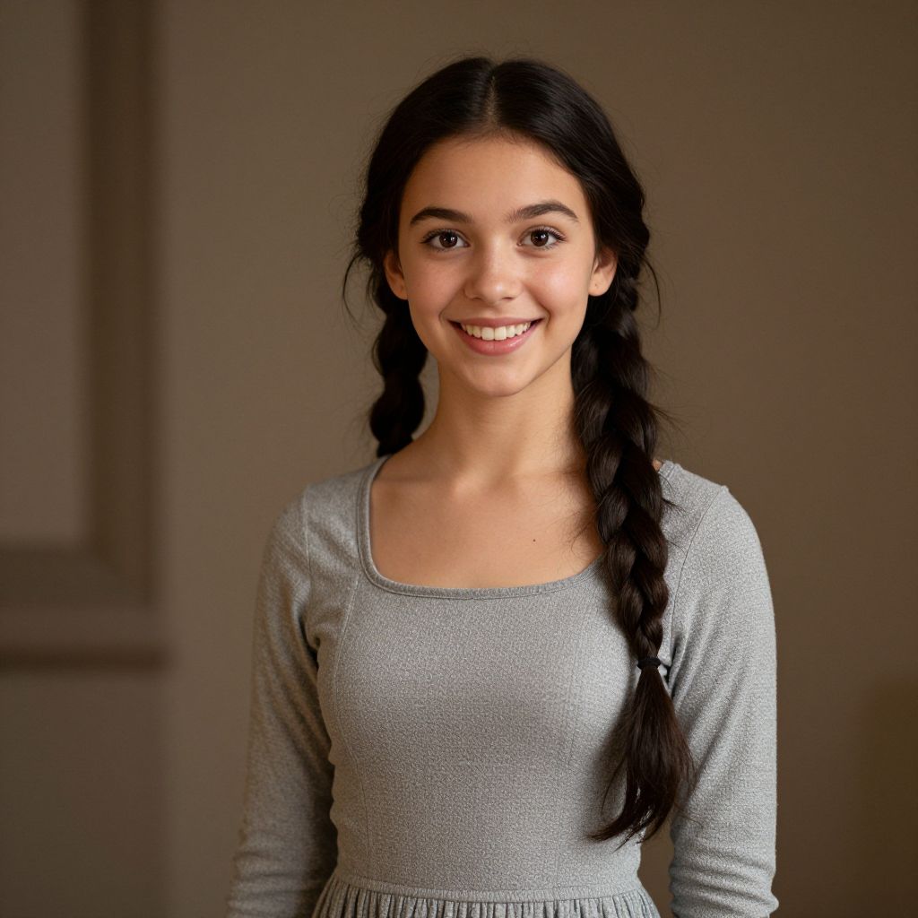 Photograph of a young woman with light brown skin and dark brown eyes, smiling at the camera. She has long, straight black hair styled in two braids over her shoulders. She wears a simple, long-sleeved, grey knit top. The background is a plain, softly lit beige wall with a dark rectangular frame on the left. The image has a warm, natural light, highlighting her clear complexion and friendly expression. The focus is sharp on her face, with a slightly blurred background.