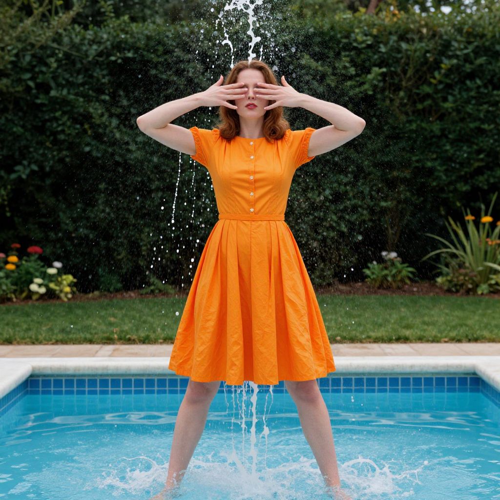 Photograph of a young white woman with light brown hair, standing in a blue swimming pool, wearing a bright orange, short-sleeved, V-neck, knee-length dress. She is splashing water with both hands above her head, creating arcs of water droplets. Her eyes are closed, and she has a joyful expression. The pool's edge is visible behind her, with a green, leafy hedge and grassy lawn in the background. The sunlight highlights the vividness of her dress and the sparkling water droplets. Her legs are slightly apart, and the water splashes around her feet.