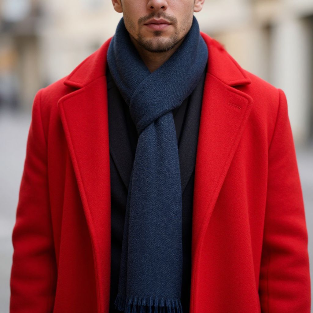 Photograph of a man from the waist up, wearing a vibrant red, woolen overcoat with broad lapels. He has a dark, navy blue, knitted scarf wrapped around his neck, covering his upper chest. His face is partially visible, showing a short, trimmed beard and mustache. The background is blurred, suggesting an outdoor urban setting with indistinct buildings and a light-colored pathway. The contrast between the red coat and navy scarf creates a striking visual. The man's expression is neutral, and his head is slightly tilted down. The image focuses on the clothing and color contrast.