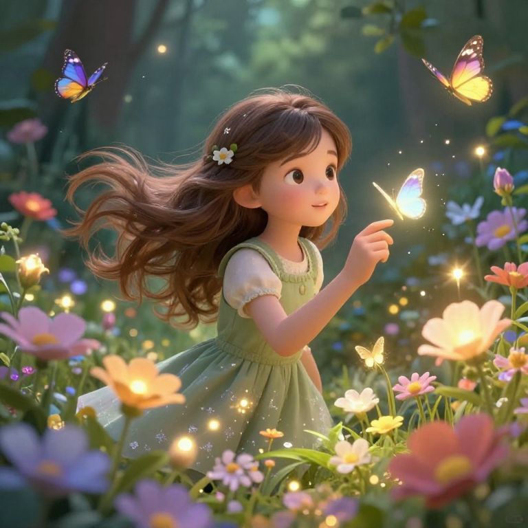 A whimsical digital illustration depicts a young child in a vibrant yellow dress standing amidst a magical meadow under a starry night sky, reaching out to a luminous flower that glows like stardust, evoking a dreamlike, celestial ambiance with soft, ethereal lighting and a blend of fantasy and realism.