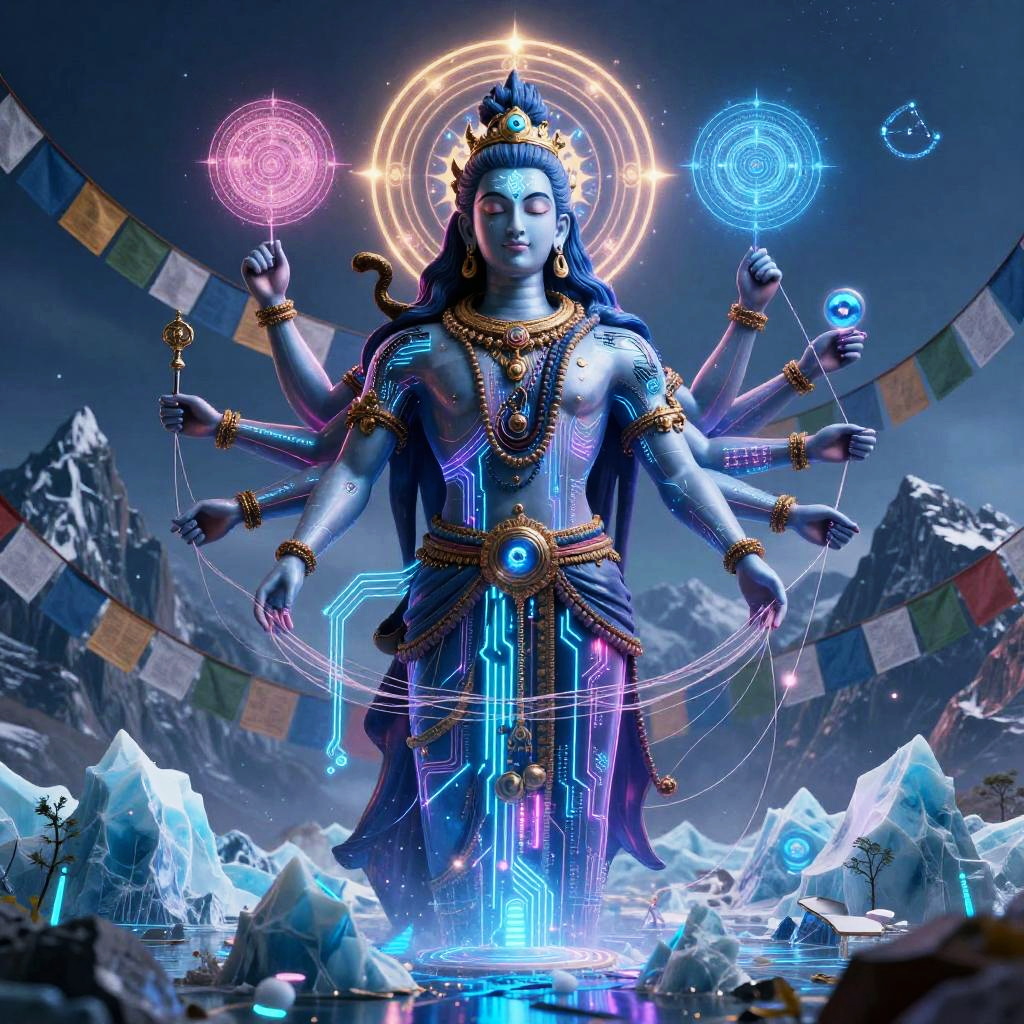 Shiva – The destroyer and god of transformation, shown as a cybernetic Shiva merging ancient iconography with neon circuitry, multiple arms weaving threads of time, a third eye glowing with binary constellations, standing in a futuristic Himalayan skyline with floating prayer flags and holographic mandalas above a neon-lit glacier.