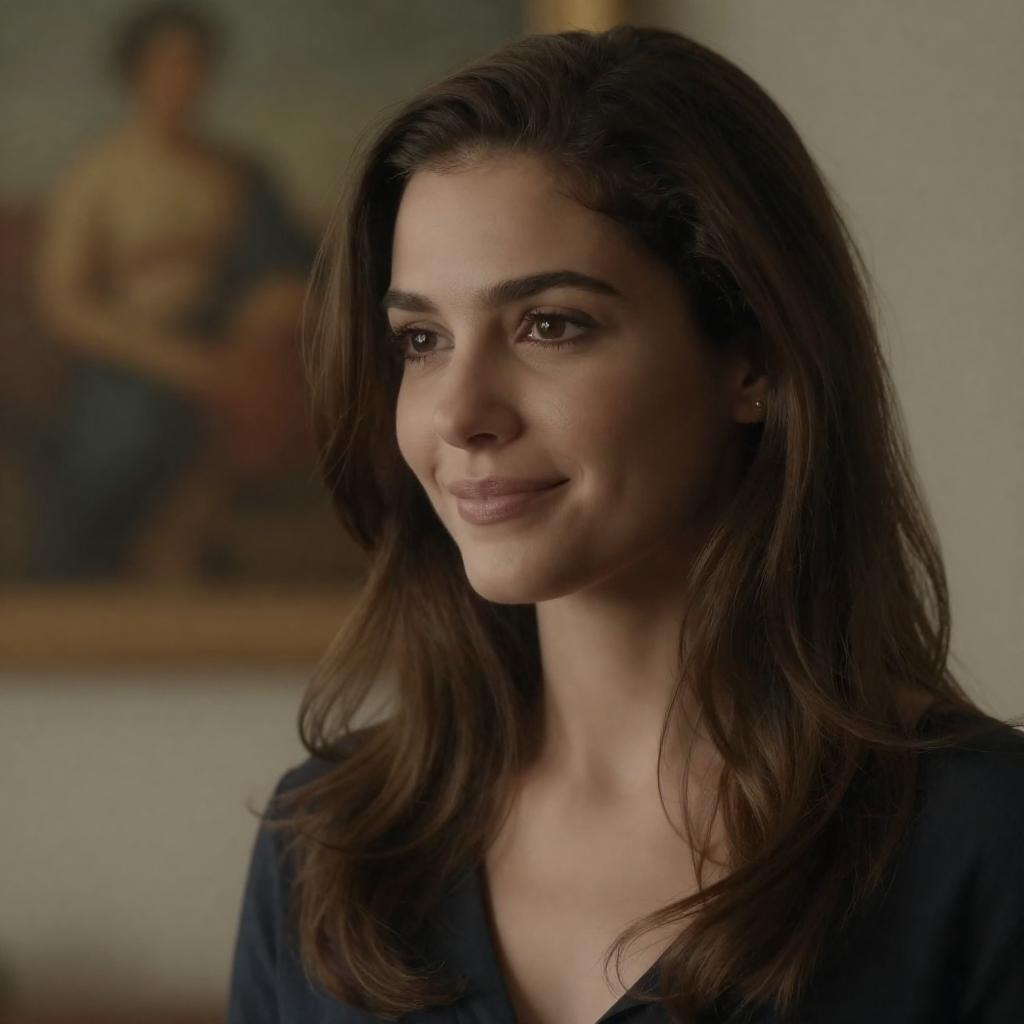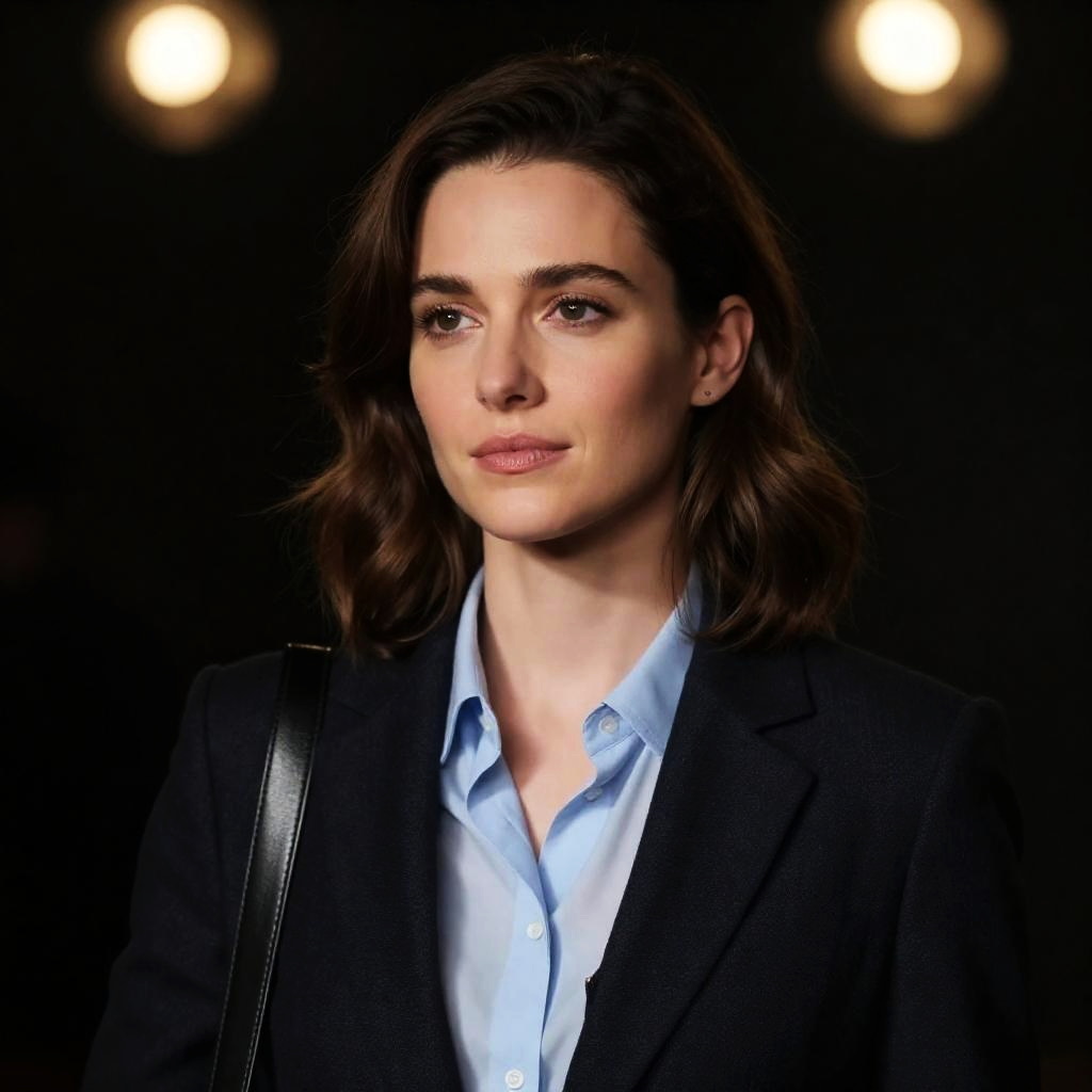 Photograph of a woman with long, wavy brown hair, wearing a light beige button-up shirt. She looks to the left with a slightly open mouth. Blurred background with warm lights. She carries a thin chain strap bag over her right shoulder. Facial expression is neutral.