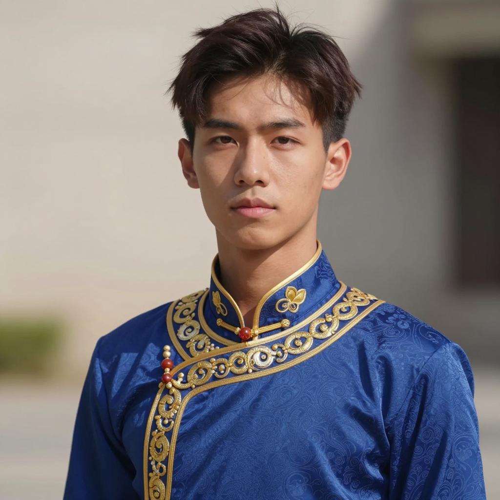 Red outfit man, photograph of a young Asian man with short black hair, red high-collared shirt, black backpack, serious expression, natural light, green blurred background, outdoor setting, summer, close-up, portrait, slight smile, label on shirt, neat appearance, medium skin tone, realistic style
