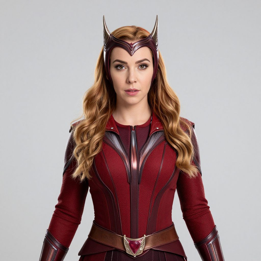 Photograph of a woman with long, wavy blonde hair, wearing a red and black superhero costume with a headpiece, against a plain white background
