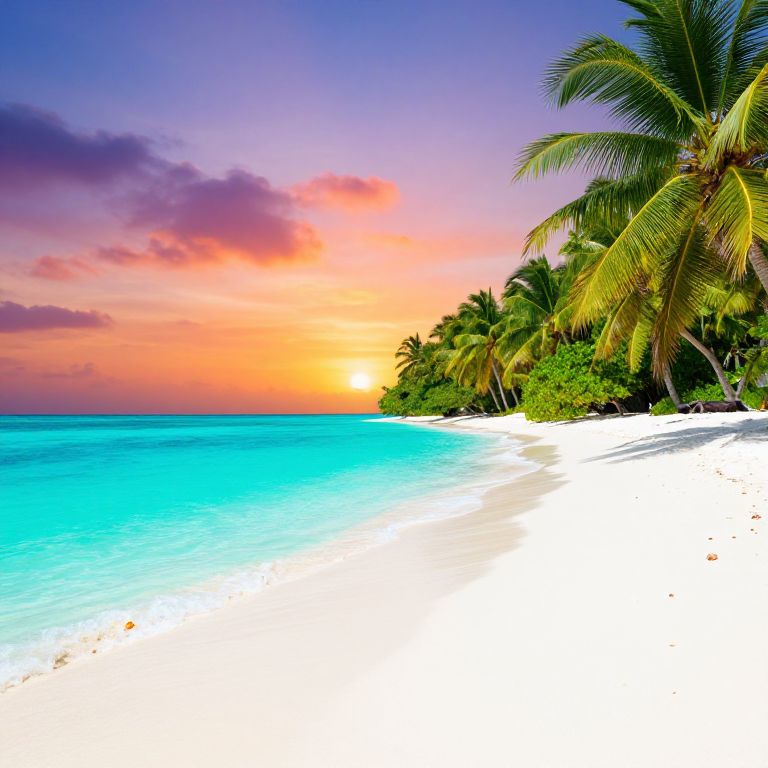 Photograph of a tropical beach at sunset, featuring vibrant turquoise water, white sand, green palm trees, and a colorful sky with orange, pink,