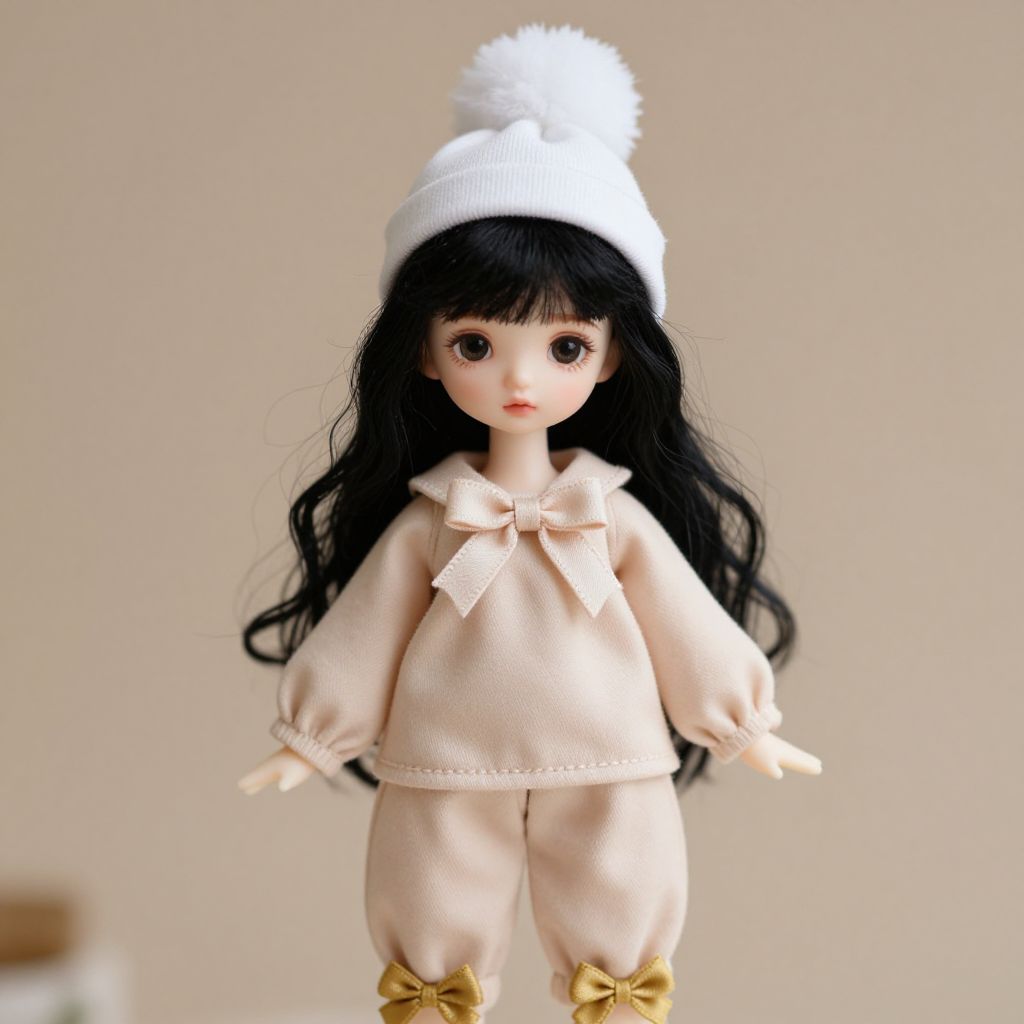 A detailed female doll with long black hair flowing gently, wearing a soft beige outfit featuring a delicate bow on the front, paired with beige pants that have a golden bow at the bottom. The doll is adorned with a white hat topped by a fluffy white pom-pom, giving it a charming and elegant appearance. The overall style is whimsical and nostalgic, with a subtle, doll-like realism that highlights the craftsmanship of the outfit and accessories. The setting is a soft, warm background with gentle lighting, emphasizing the doll's gentle and sweet aesthetic.